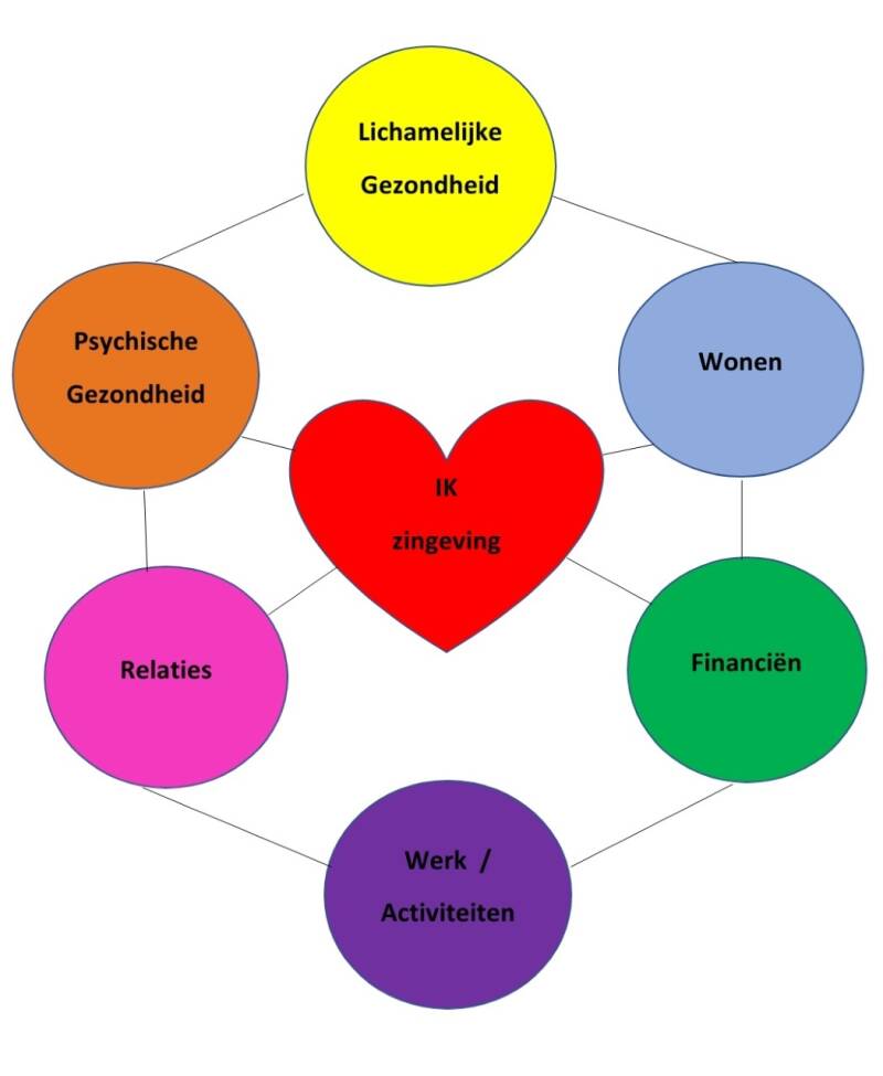 De onderstaande 7 levensgebieden in een cirkel is voor iedereen relevant en laat zien dat het nauw met elkaar samenhangt. Door deze levensgebieden te doorlopen krijgt je inzicht waar je in vastloopt en waar je verbetering wilt. Hierdoor kan je samen met je begeleider concrete doelen stellen voor het komende jaar, waar je echt aan kan werken.